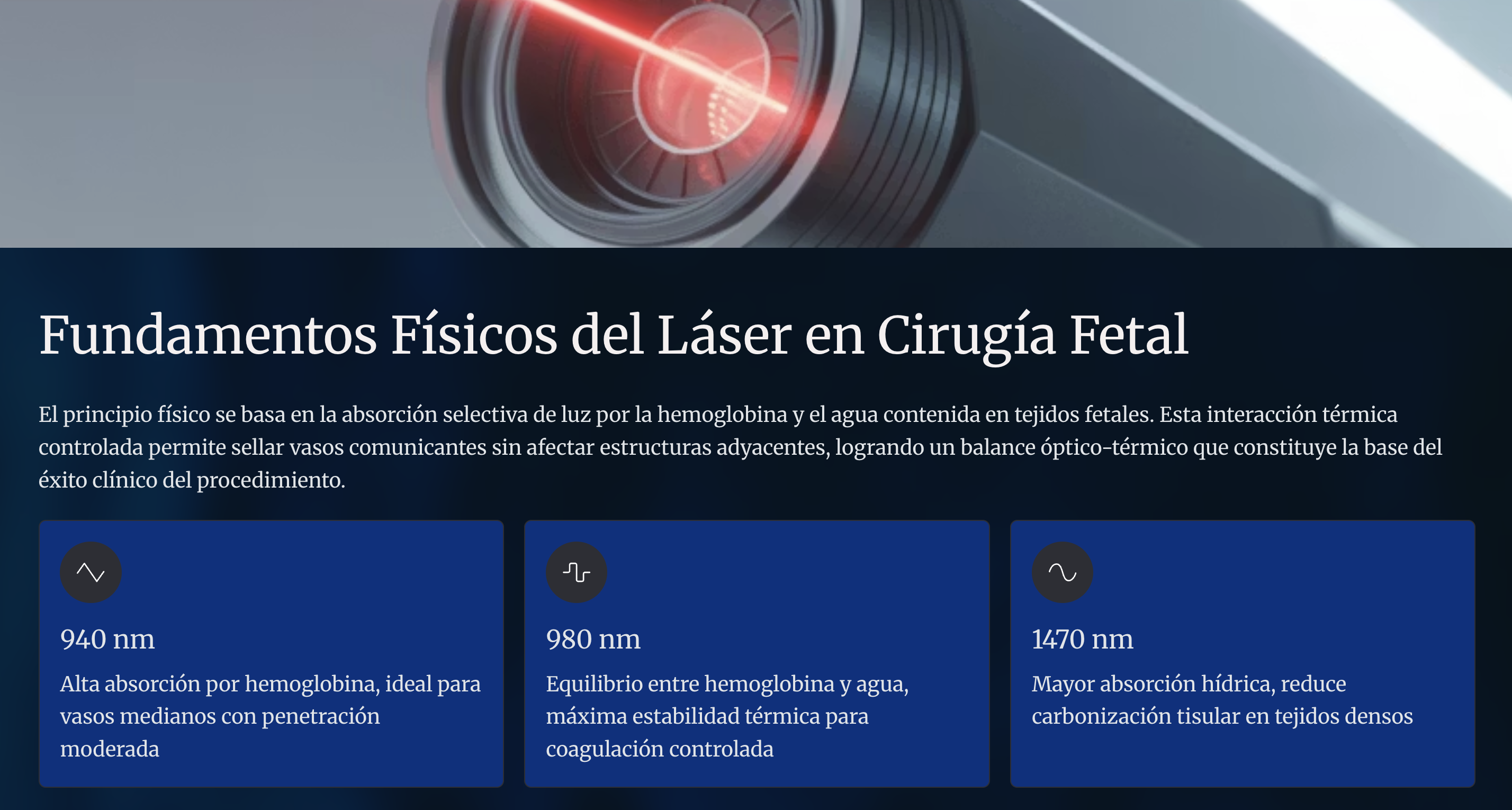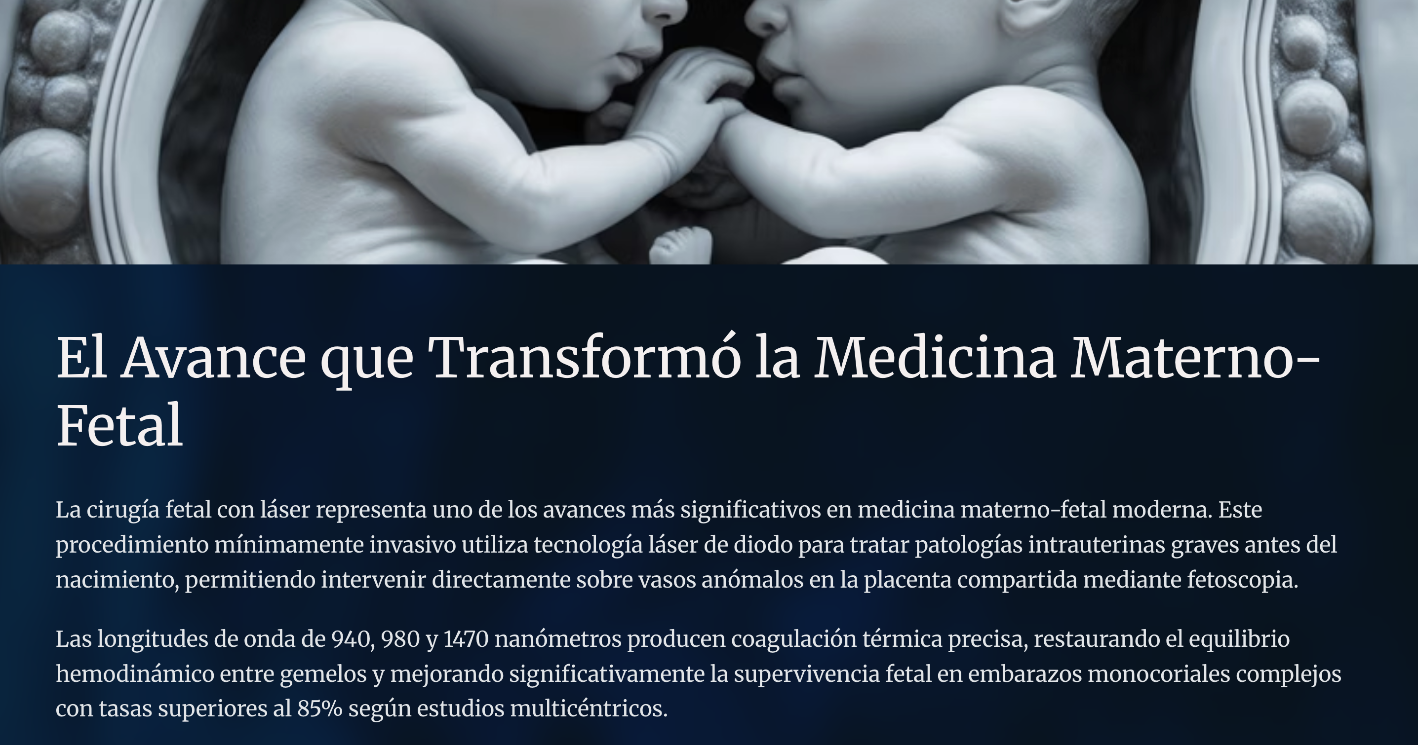 La cirugia fetal con laser representa uno de los avances más importantes en la medicina materno-fetal moderna, al permitir tratar patologías intrauterinas graves antes del nacimiento. Se trata de un procedimiento mínimamente invasivo realizado mediante fetoscopia, en el cual se introduce una fibra óptica conectada a un generador de energia luminosa coherente. Este tipo de tecnologia, basada en longitudes de onda de 940, 980 y 1470 nanometros, produce una coagulación térmica precisa sobre vasos anómalos de la placenta compartida. Gracias a esta intervención, es posible restaurar el equilibrio hemodinámico entre gemelos y mejorar significativamente la supervivencia fetal en embarazos monocoriales complejos.