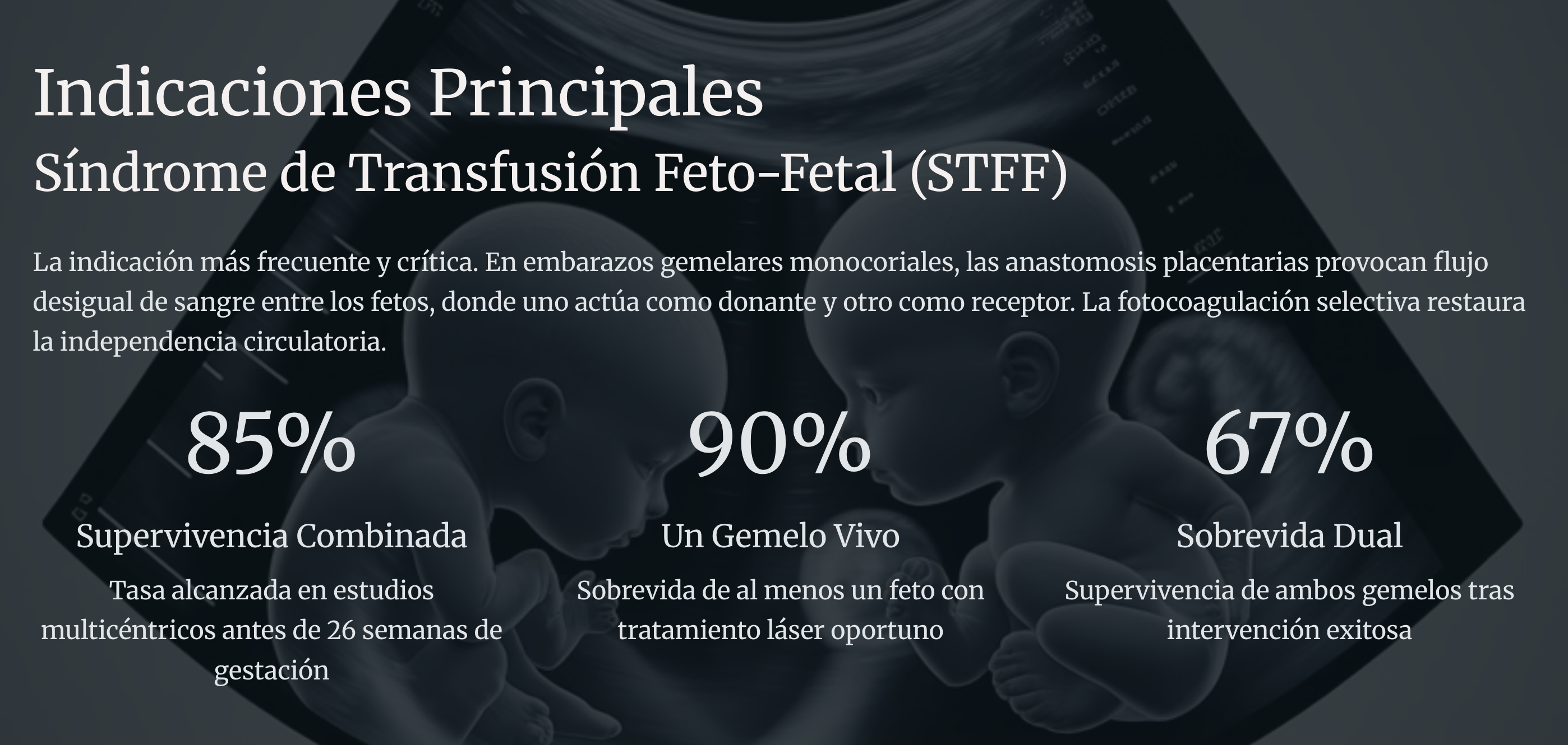 La cirugia fetal con laser se realiza principalmente para tratar el Síndrome de Transfusión Feto-Fetal (STFF), una complicación exclusiva de embarazos gemelares monocoriales. En esta condición, las anastomosis placentarias provocan un flujo desigual de sangre entre los fetos, donde uno actúa como donante y el otro como receptor. El objetivo del procedimiento es fotocoagular selectivamente estas conexiones vasculares para restablecer la independencia circulatoria. La intervención se practica idealmente antes de las 26 semanas de gestación y ha demostrado una tasa de supervivencia combinada superior al 85% según estudios multicéntricos como los de Senat et al. (NEJM, 2004).
