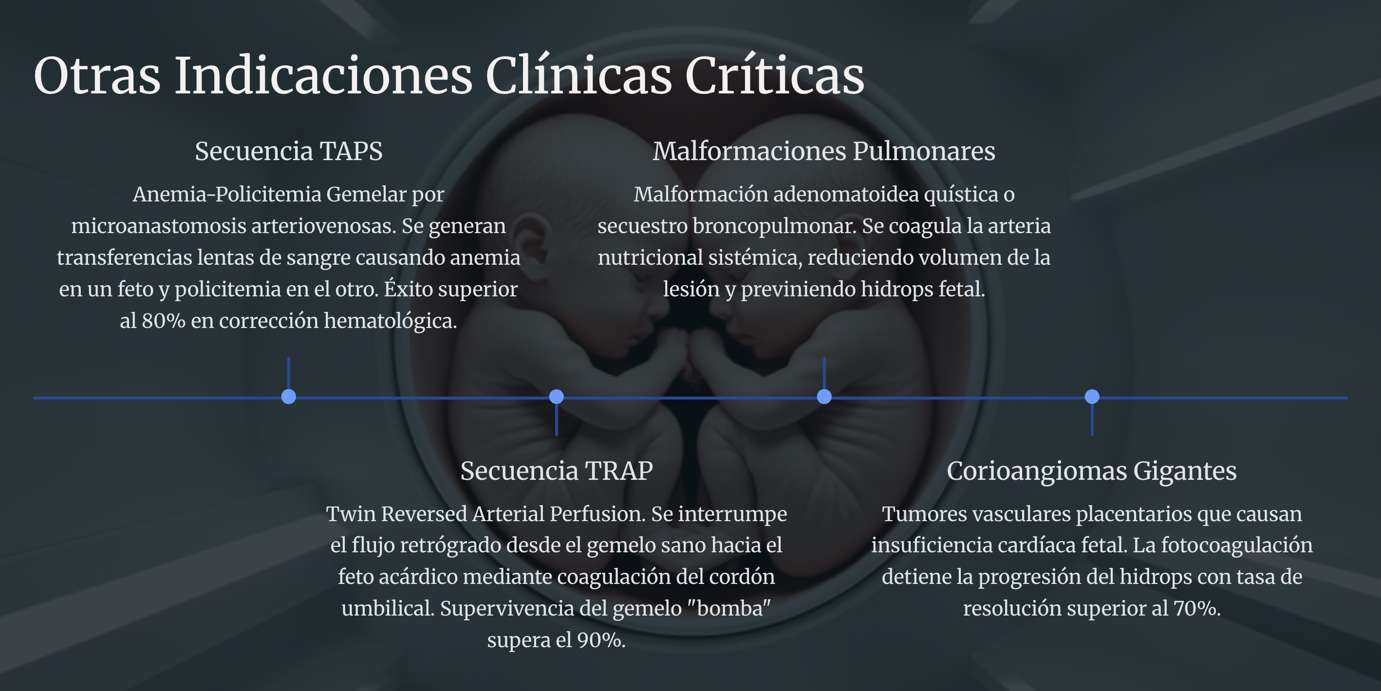 Otra indicación importante para la cirugia fetal con laser es la Secuencia de Anemia-Policitemia Gemelar (TAPS). En este trastorno, microanastomosis arteriovenosas generan transferencias lentas de sangre entre los fetos, causando anemia en uno y policitemia en el otro. Mediante fotocoagulación selectiva con laser de 940 o 980 nm, los especialistas sellan las microconexiones para estabilizar la hemodinámica fetal. Los resultados reportan tasas de éxito superiores al 80% en la corrección hematológica y una reducción marcada del daño cerebral hipóxico. Su aplicación temprana es determinante para preservar la función neurológica.