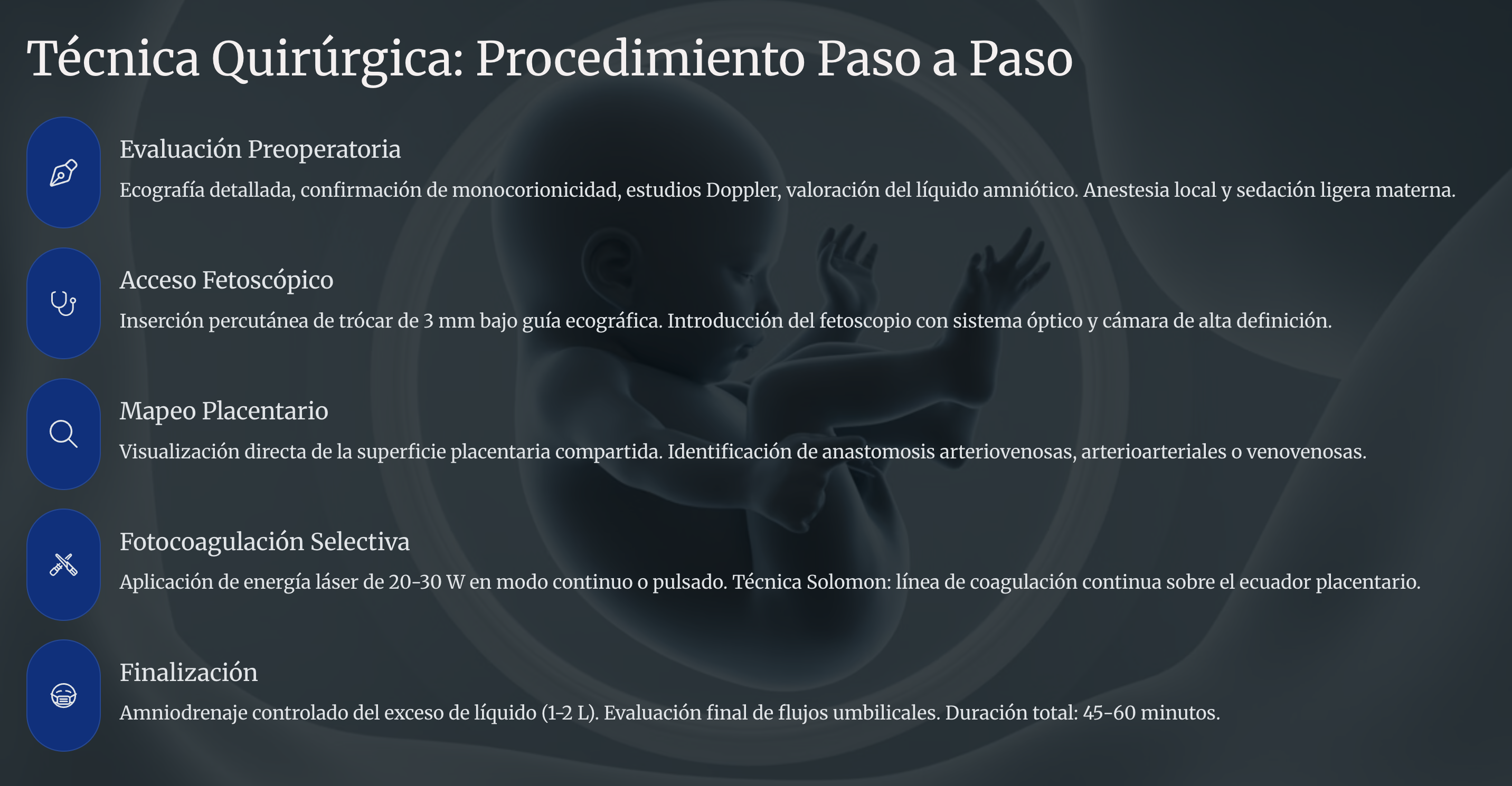 La técnica quirúrgica de la cirugia fetal con laser comienza con una evaluación ecográfica detallada y la confirmación de monocorionicidad. Posteriormente, se introduce un trócar de 3 mm en la cavidad amniótica bajo guía ecográfica, a través del cual se inserta el fetoscopio. Este instrumento permite visualizar directamente la superficie placentaria compartida. Una vez localizadas las anastomosis, se aplica energia laser continua o pulsada utilizando densidades de 20 a 30 W. Dependiendo del tipo de equipo, se emplean longitudes de 940, 980 o 1470 nm, asegurando una coagulación uniforme y efectiva de los vasos intergemelares.