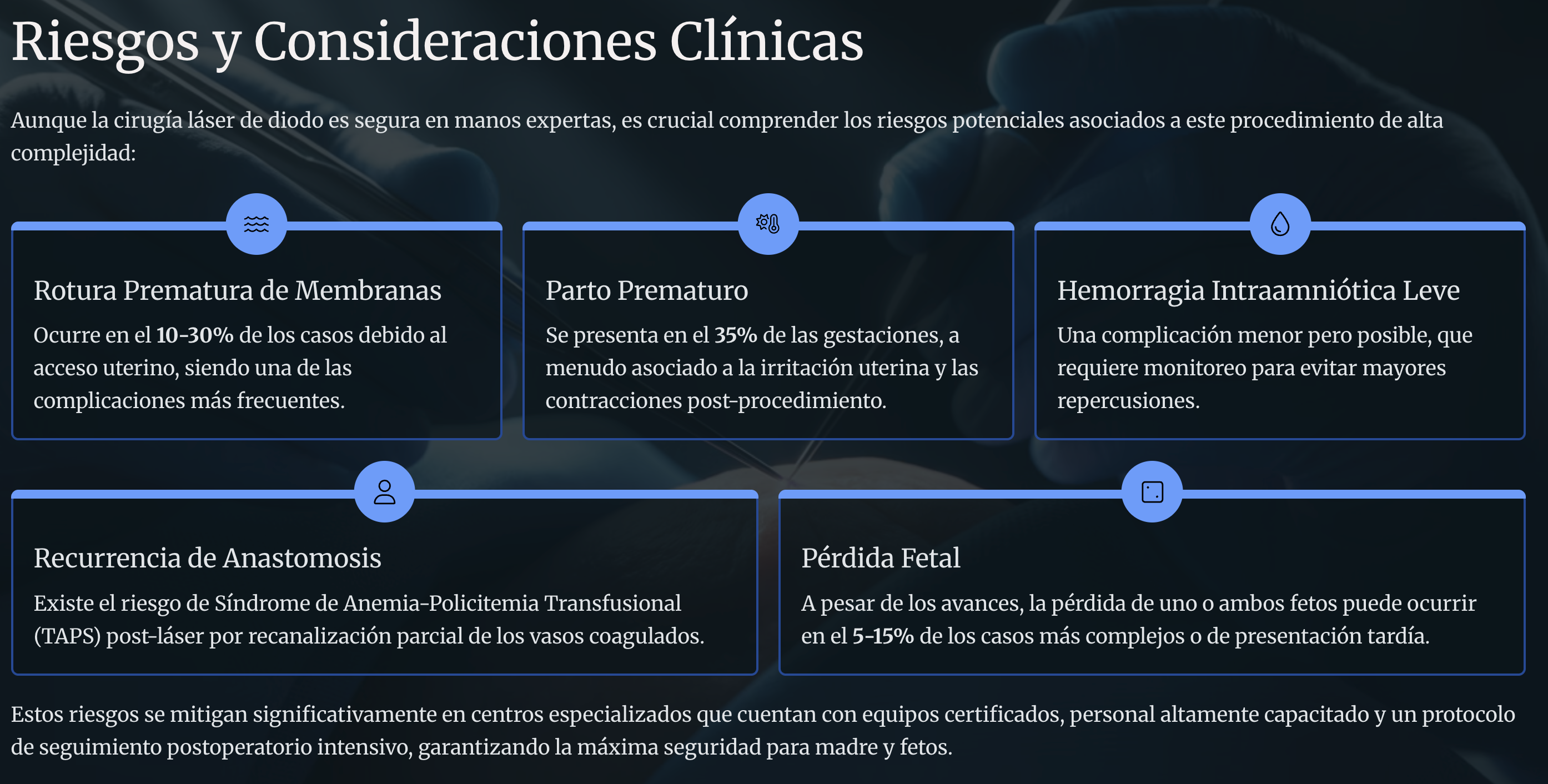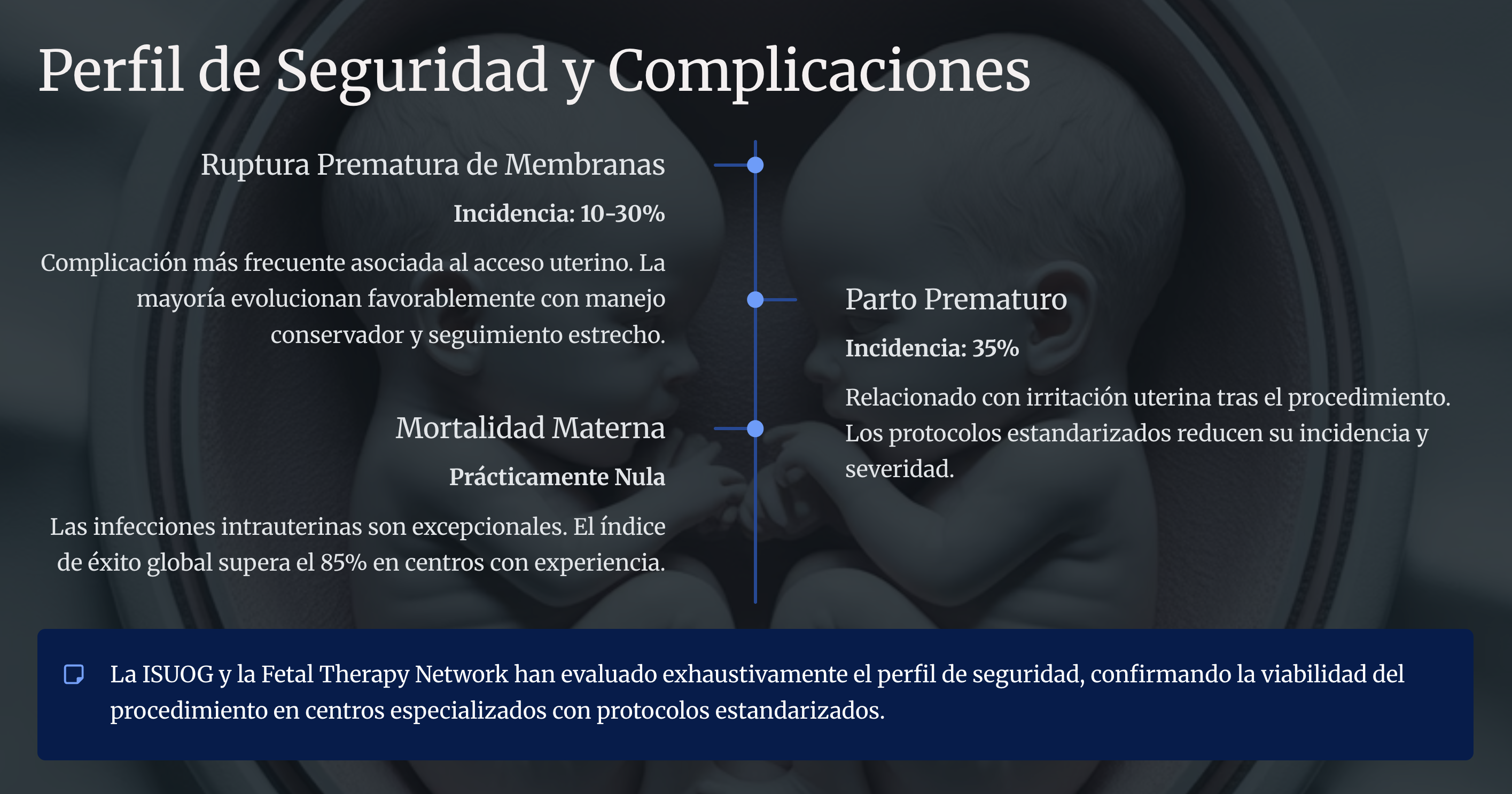 El perfil de seguridad de la cirugia fetal con laser ha sido evaluado por la ISUOG y la Fetal Therapy Network. Las complicaciones más frecuentes incluyen ruptura prematura de membranas (10–30%) y parto prematuro (35%). Sin embargo, la mayoría de los casos evolucionan favorablemente con manejo conservador. La mortalidad materna es prácticamente nula y las infecciones intrauterinas son excepcionales. Estos datos refuerzan la viabilidad del procedimiento en centros con experiencia, donde el índice de éxito global supera el 85% de supervivencia de al menos un gemelo.