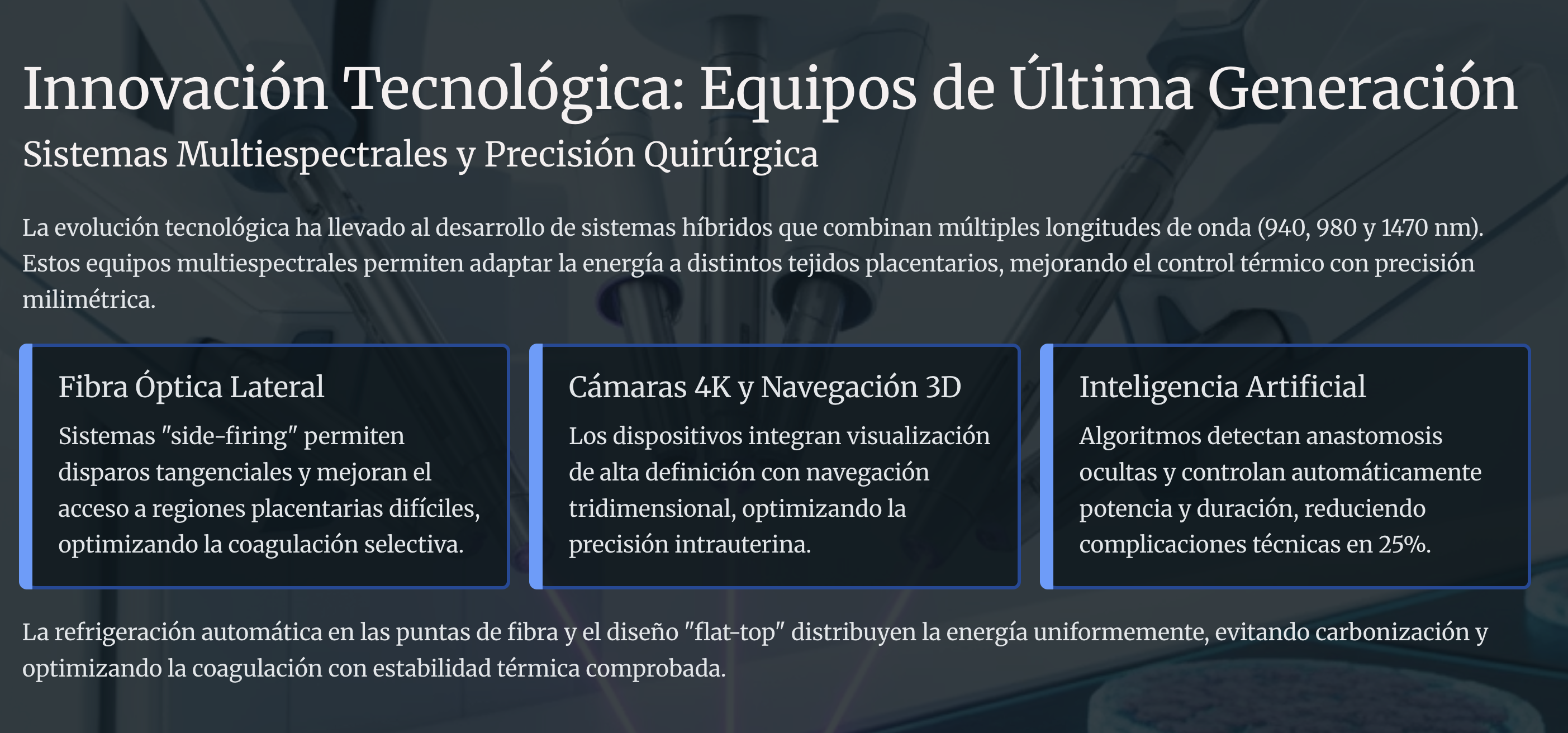 En términos tecnológicos, la cirugia fetal con laser ha evolucionado hacia sistemas híbridos que combinan longitudes múltiples de onda (940, 980 y 1470 nm). Estos equipos multiespectrales permiten adaptar la energía a distintos tejidos placentarios y mejorar el control térmico. Su uso se extiende también a procedimientos experimentales, como la ablación de vasos en malformaciones hepáticas fetales. La precisión milimétrica de estos sistemas ha reducido las lesiones térmicas no deseadas, situando al laser como la herramienta más segura en la cirugía intrauterina contemporánea.