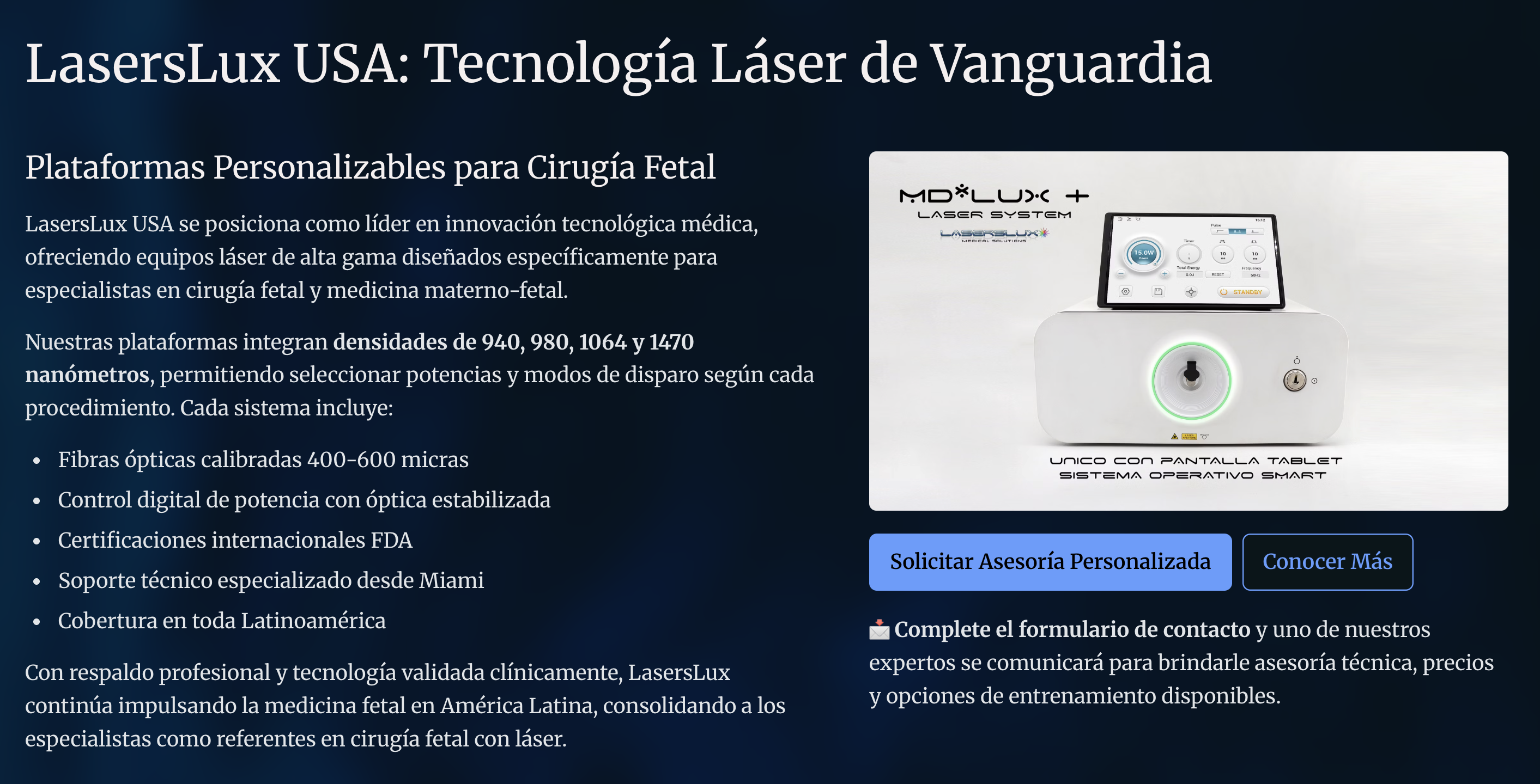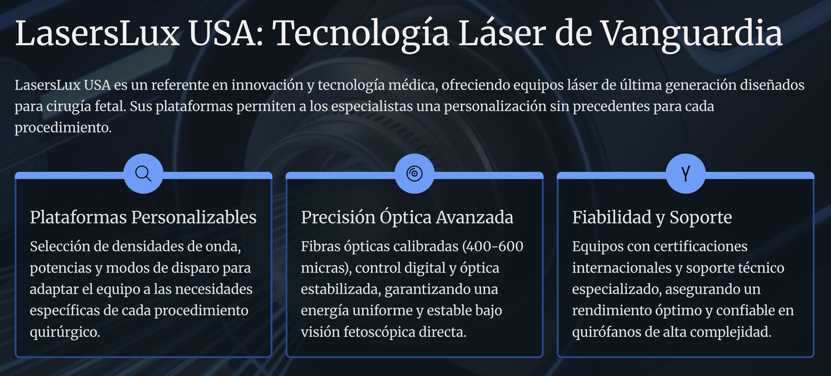 Gracias a esta combinación de versatilidad tecnológica, precisión milimétrica y acompañamiento profesional, LasersLux continúa impulsando la medicina fetal en América Latina, ofreciendo soluciones integrales que contribuyen a salvar vidas antes del nacimiento y consolidan a los especialistas en cirugía fetal con laser como referentes en su área.