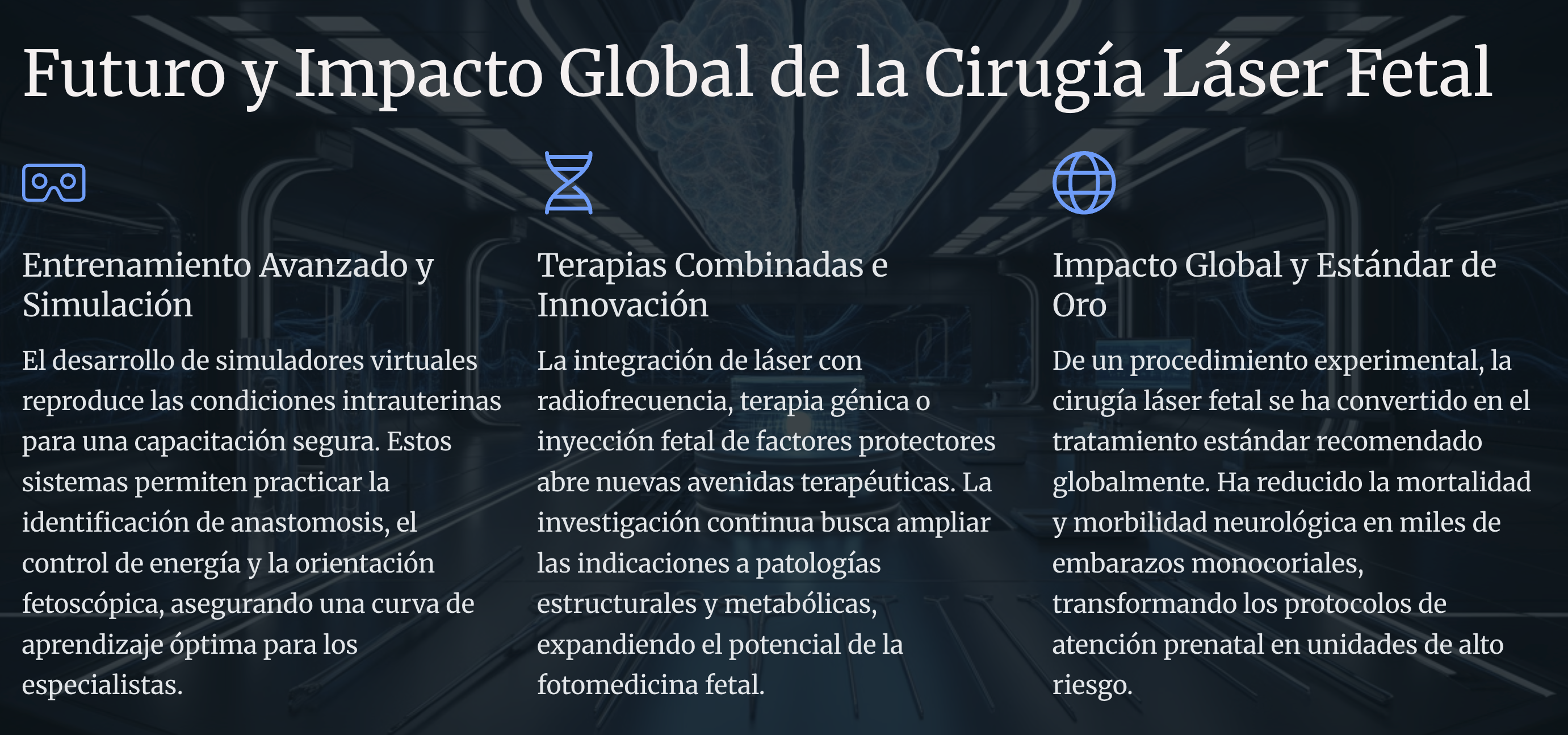 El impacto global de la cirugia fetal con laser en la práctica obstétrica ha sido transformador. De un procedimiento experimental en los años noventa pasó a ser el tratamiento estándar recomendado por la ISUOG, la Fetal Therapy Network y la OMS. Miles de embarazos monocoriales se benefician cada año con esta tecnología. Las estadísticas muestran reducciones sostenidas en la mortalidad fetal y en la morbilidad neurológica neonatal. Su implementación ha redefinido los protocolos de atención prenatal en unidades de alto riesgo alrededor del mundo.