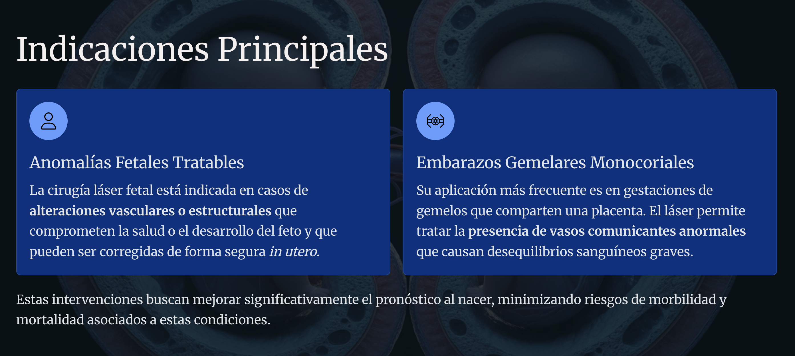La cirugía fetal con laser se indica cuando existen alteraciones vasculares o estructurales en el feto (o fetos) que pueden ser tratadas intraútero para mejorar el pronóstico. Su uso más frecuente es en embarazos gemelares monocoriales, donde ambos fetos comparten una sola placenta con vasos comunicantes anormales.