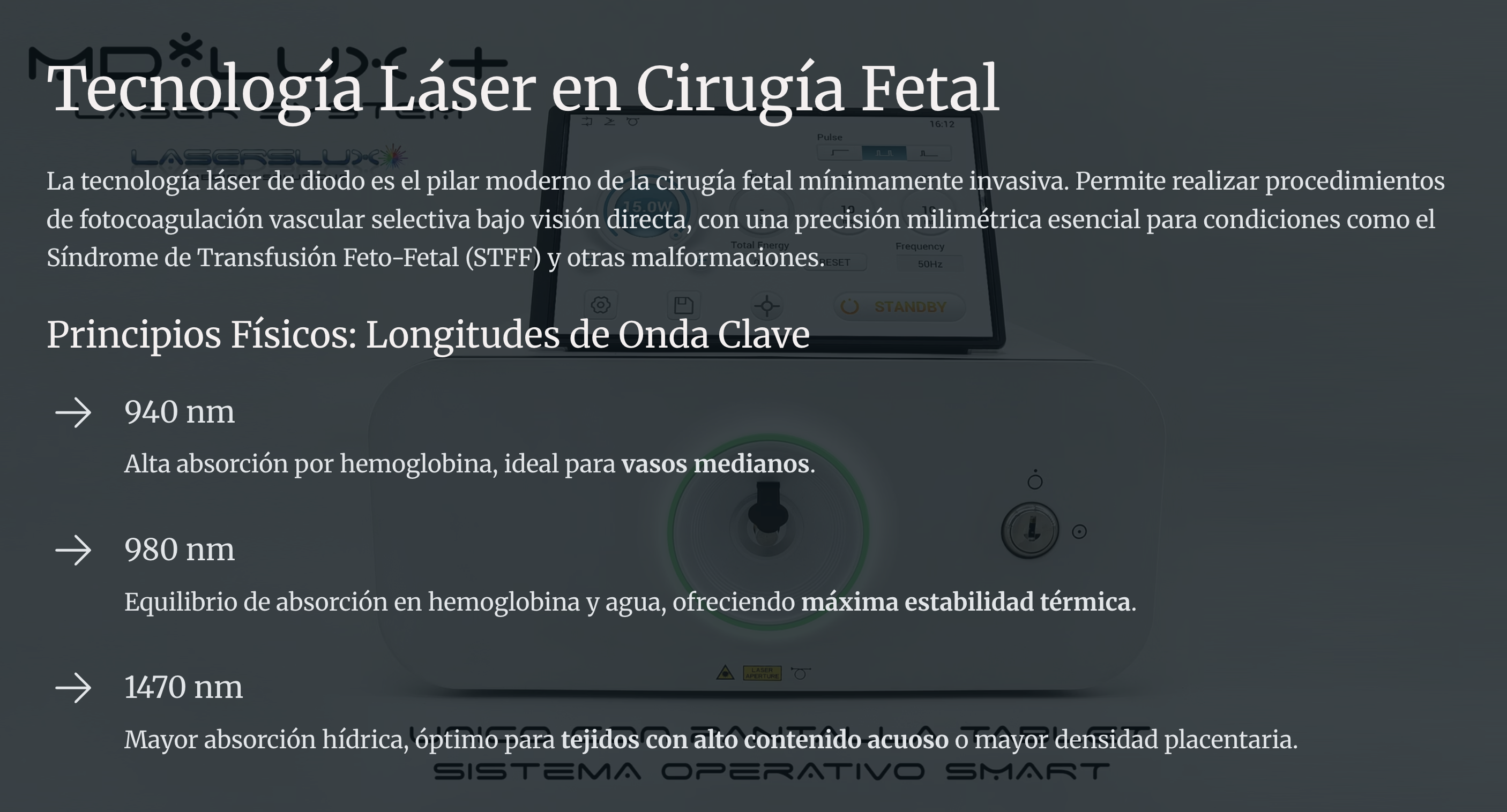 La evolución de la cirugía fetal mínimamente invasiva ha sido posible gracias al desarrollo de plataformas de laser de diodo cada vez más precisas, seguras y versátiles. Hoy en día, los equipos con longitudes de 940, 980, 1064 y 1470 nanómetros representan el estándar internacional para la fotocoagulación selectiva en fetoscopia, asegurando resultados clínicos superiores y mínimos riesgos térmicos.