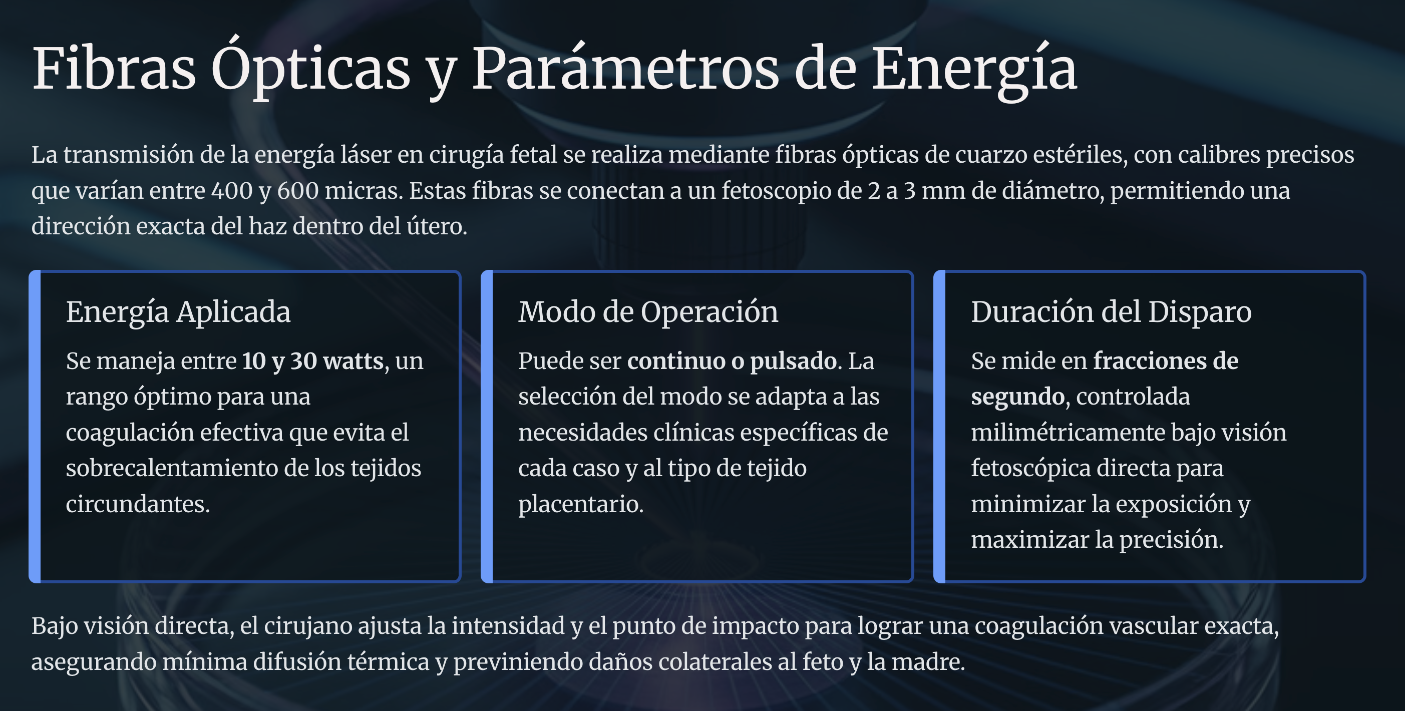 La energia del laser de diodo se transmite a través de fibras ópticas de cuarzo estériles, con calibres que varían entre 400 y 600 micras. Estas fibras, conectadas a un fetoscopio de 2 a 3 mm de diámetro, permiten dirigir el haz con precisión dentro del útero.