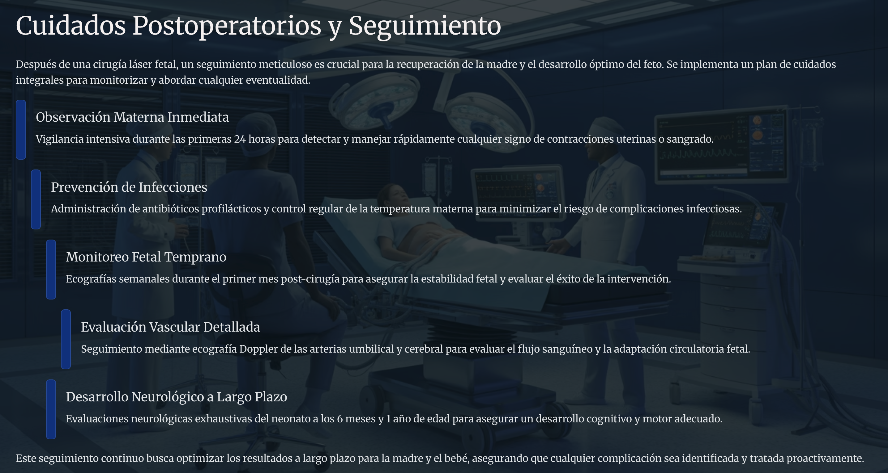 La logística de la cirugia fetal con laser requiere un entorno controlado, equipos estériles y personal altamente especializado. La intervención se realiza en quirófanos equipados con monitoreo fetal continuo y soporte neonatal inmediato. Tras el procedimiento, las pacientes reciben profilaxis antibiótica y reposo. El seguimiento incluye Doppler seriado y control del crecimiento fetal. Los protocolos internacionales recomiendan planificar el parto entre las 34 y 36 semanas, una vez garantizada la estabilidad hemodinámica. Este enfoque integral maximiza los beneficios de la terapia intrauterina.