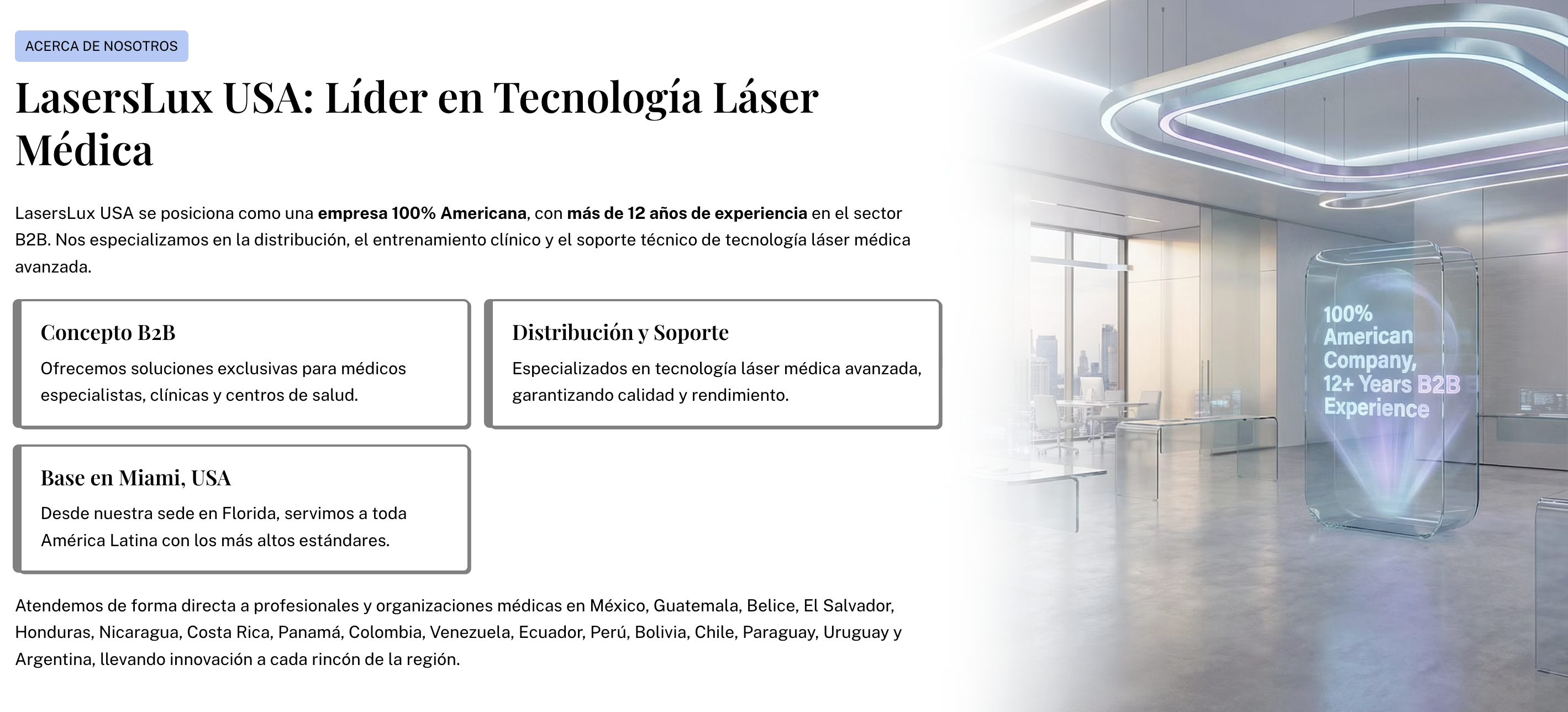 LasersLux USA es una empresa 100% americana con mas de 12 años de experiencia en el sector B2B especializada en la distribución, entrenamiento clínico y soporte técnico de tecnología láser médica avanzada, dirigida exclusivamente a médicos especialistas, clínicas y centros de salud en América Latina, con base operativa en Miami, Estados Unidos, atendiendo de forma directa a profesionales y organizaciones médicas en México, Guatemala, Belice, El Salvador, Honduras, Nicaragua, Costa Rica, Panamá, Colombia, Venezuela, Ecuador, Perú, Bolivia, Chile, Paraguay, Uruguay y Argentina.
