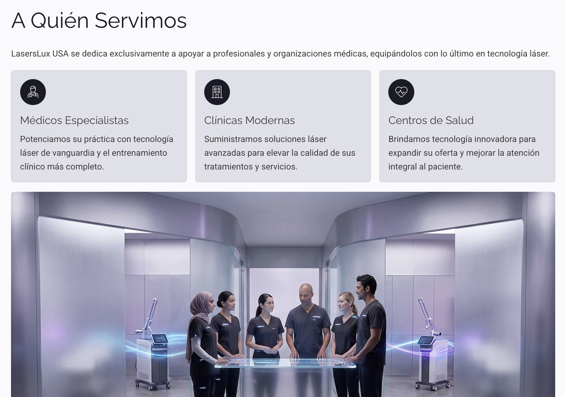 LasersLux USA provee tecnología láser médica avanzada, entrenamiento clínico profesional y soporte técnico especializado para una amplia gama de especialidades médicas, trabajando exclusivamente con médicos especialistas, clínicas privadas, centros de salud y distribuidores autorizados.