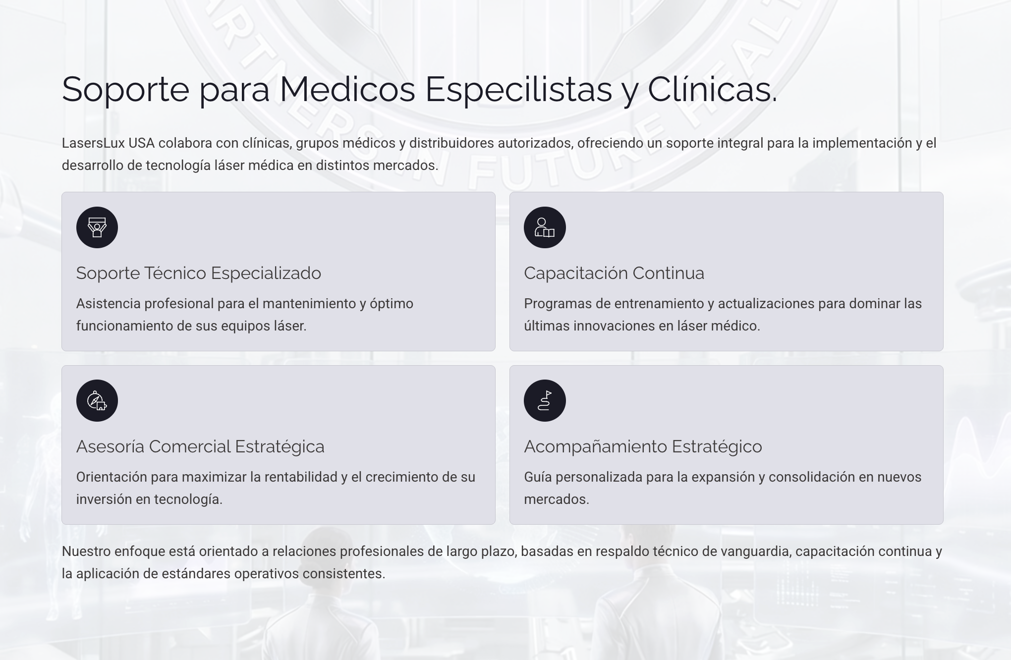 LasersLux USA colabora con clínicas, grupos médicos y distribuidores autorizados, ofreciendo soporte técnico, capacitación, asesoría comercial y acompañamiento estratégico para la implementación de tecnología láser médica en distintos mercados.