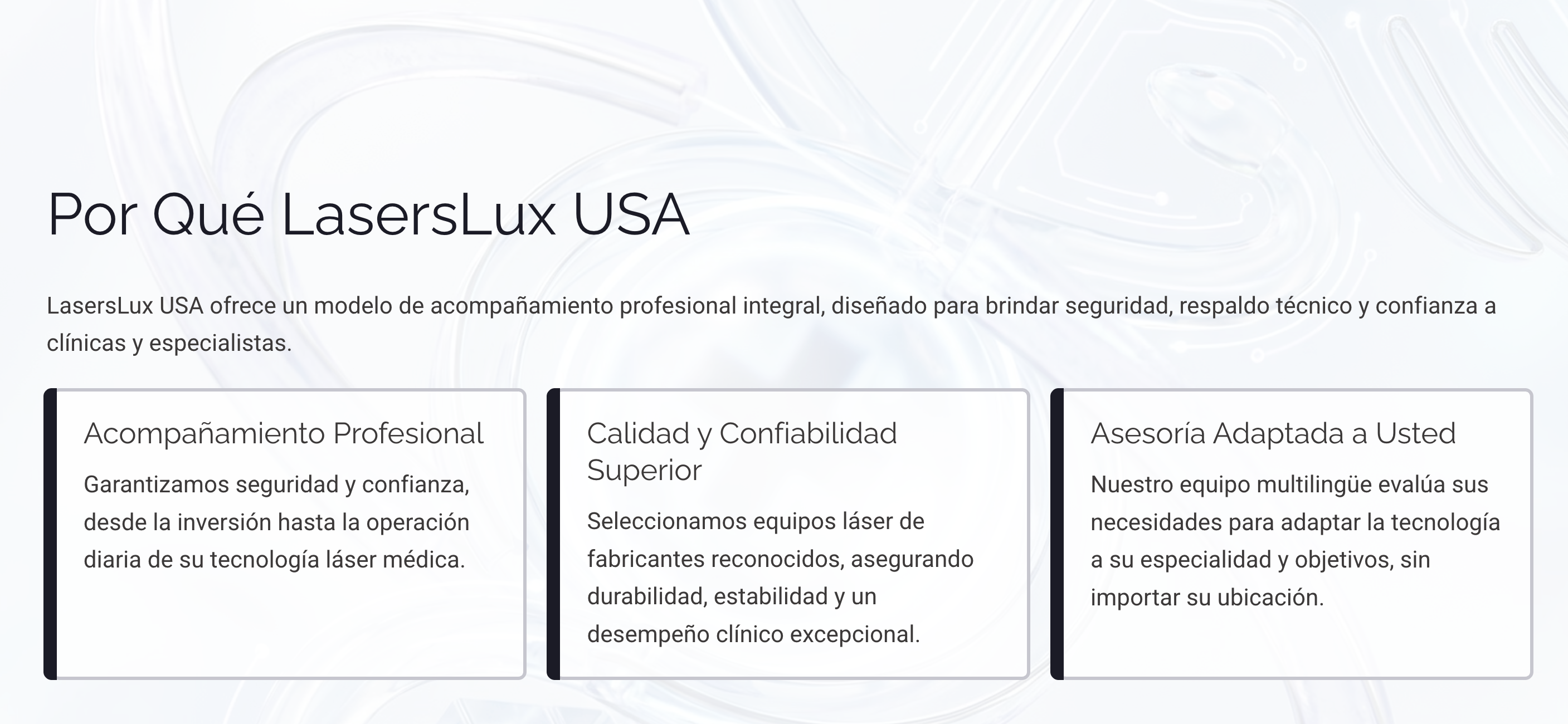 LasersLux USA ofrece un modelo de acompañamiento profesional diseñado para brindar seguridad, respaldo técnico y confianza a médicos especialistas y clínicas al momento de invertir en tecnología láser médica con respaldo operativo desde Estados Unidos.