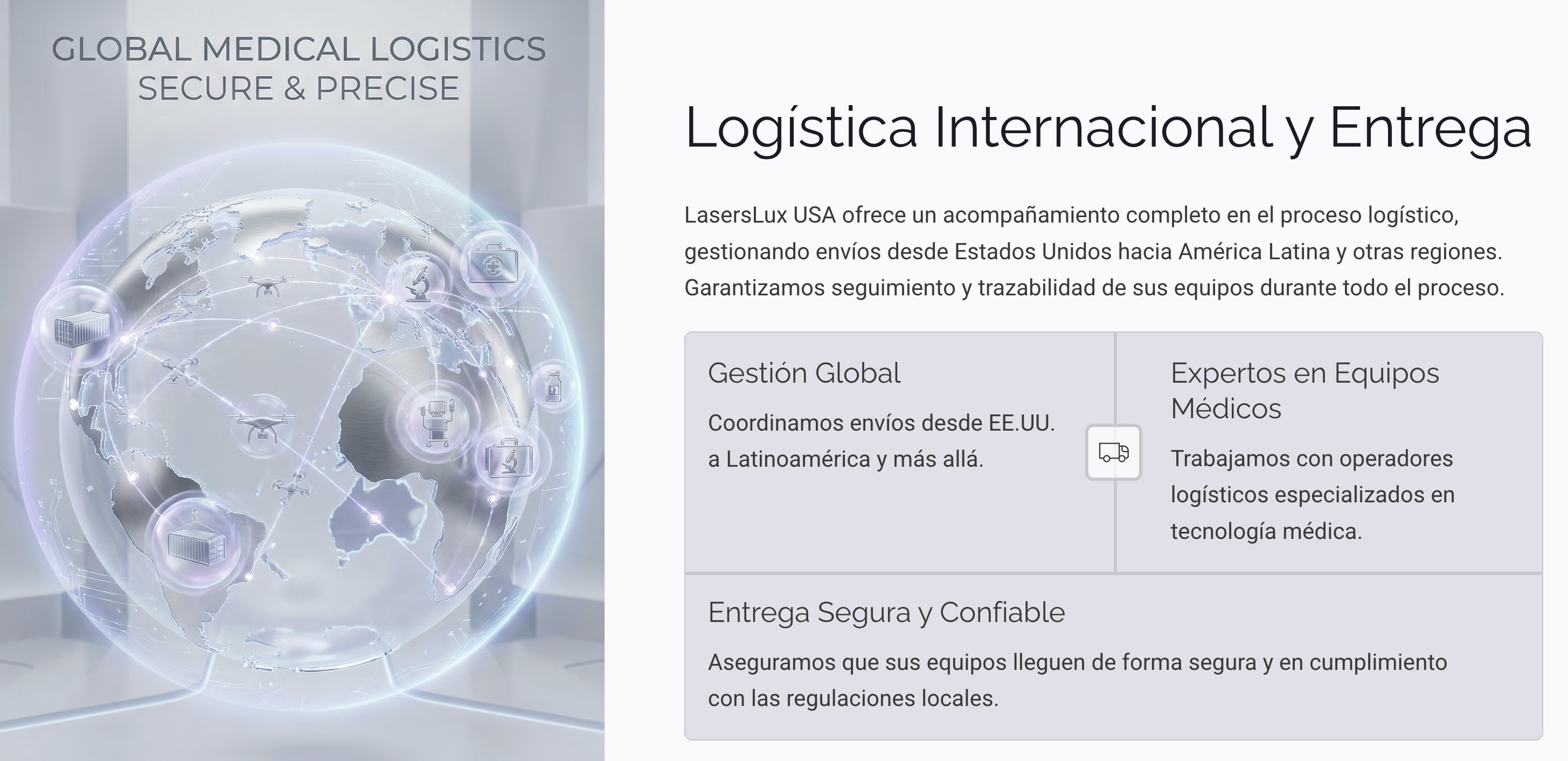 LasersLux USA brinda acompañamiento completo en el proceso logístico internacional, gestionando envíos desde Estados Unidos hacia América Latina y otras regiones, con seguimiento y trazabilidad del equipo durante todo el proceso.