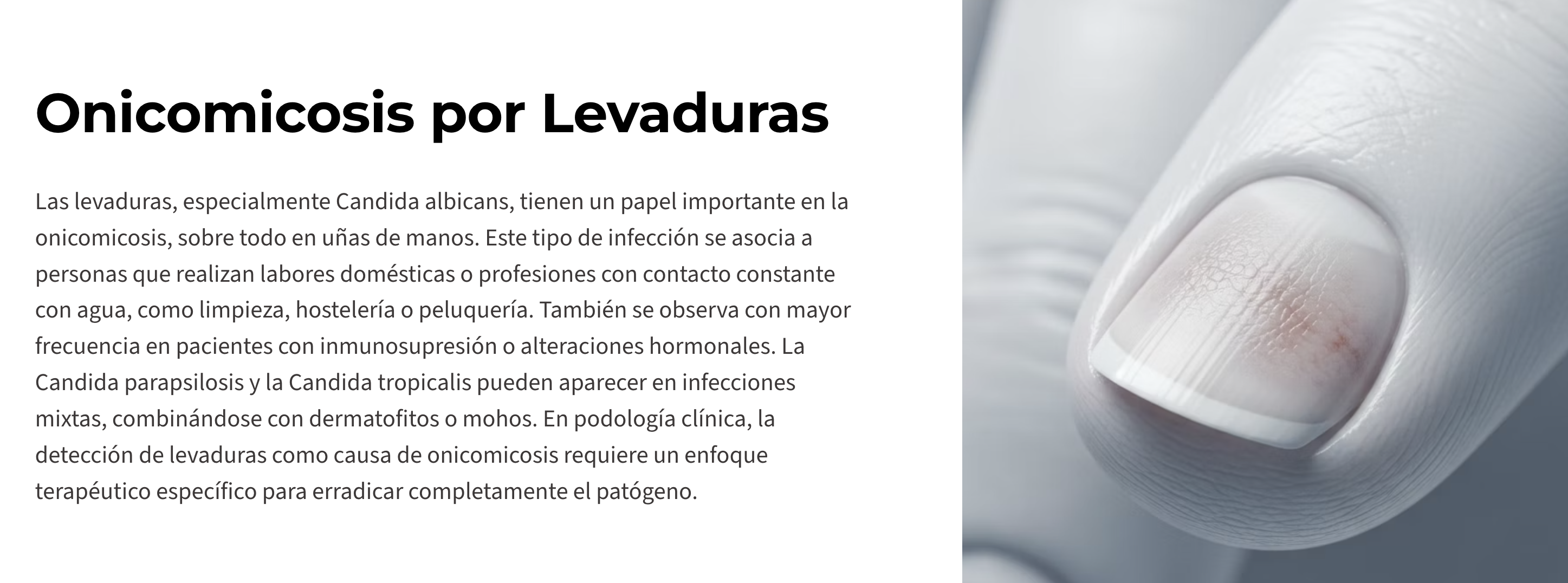 Las levaduras, especialmente Candida albicans, tienen un papel importante en la onicomicosis, sobre todo en uñas de manos. Este tipo de infección se asocia a personas que realizan labores domésticas o profesiones con contacto constante con agua, como limpieza, hostelería o peluquería. También se observa con mayor frecuencia en pacientes con inmunosupresión o alteraciones hormonales. La Candida parapsilosis y la Candida tropicalis pueden aparecer en infecciones mixtas, combinándose con dermatofitos o mohos. En podología clínica, la detección de levaduras como causa de onicomicosis requiere un enfoque terapéutico específico para erradicar completamente el patógeno.