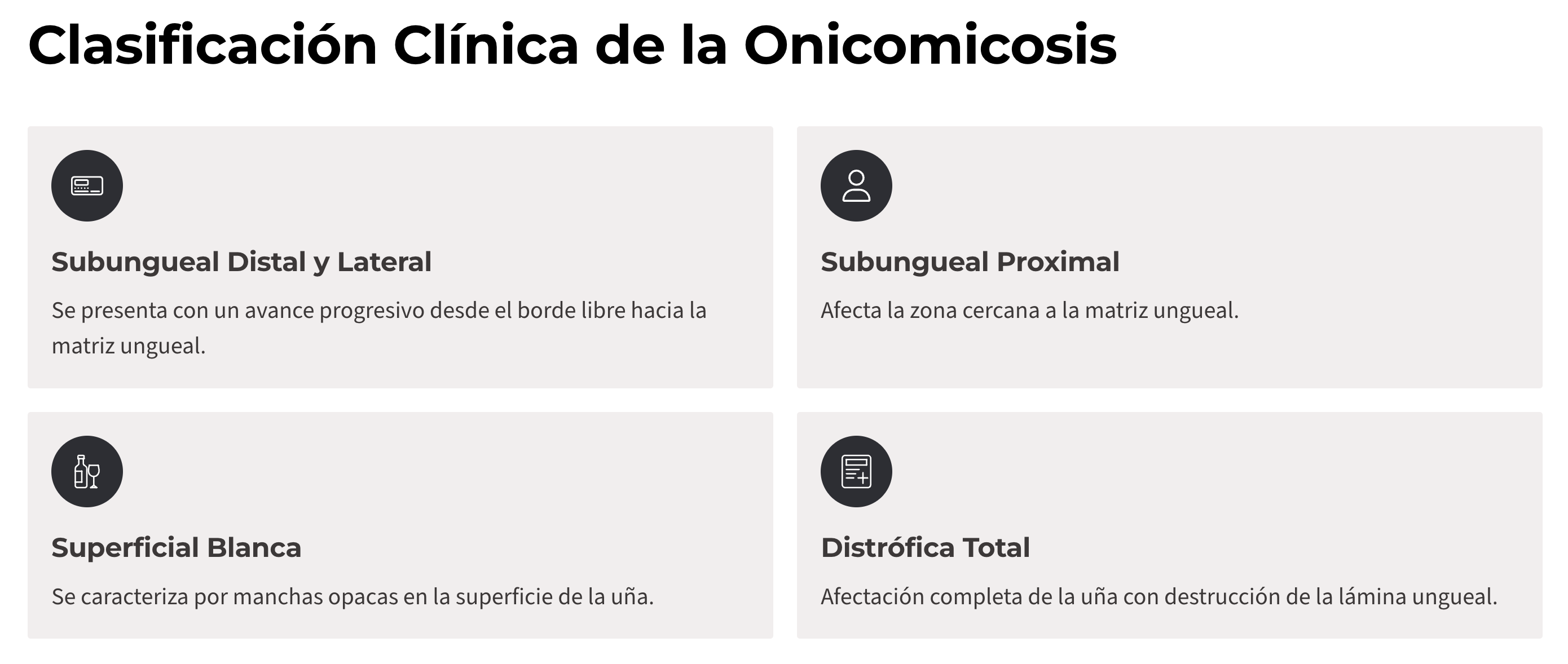 La onicomicosis puede clasificarse clínicamente en varios tipos: subungueal distal y lateral, subungueal proximal, superficial blanca y distrófica total. Cada tipo presenta un patrón característico de afectación de la uña y requiere estrategias terapéuticas adaptadas. Por ejemplo, la forma subungueal distal se presenta con un avance progresivo desde el borde libre hacia la matriz ungueal. En cambio, la forma superficial blanca se caracteriza por manchas opacas en la superficie de la uña. La clasificación correcta permite al podólogo definir el plan de acción más adecuado para combatir la onicomicosis en cada paciente.