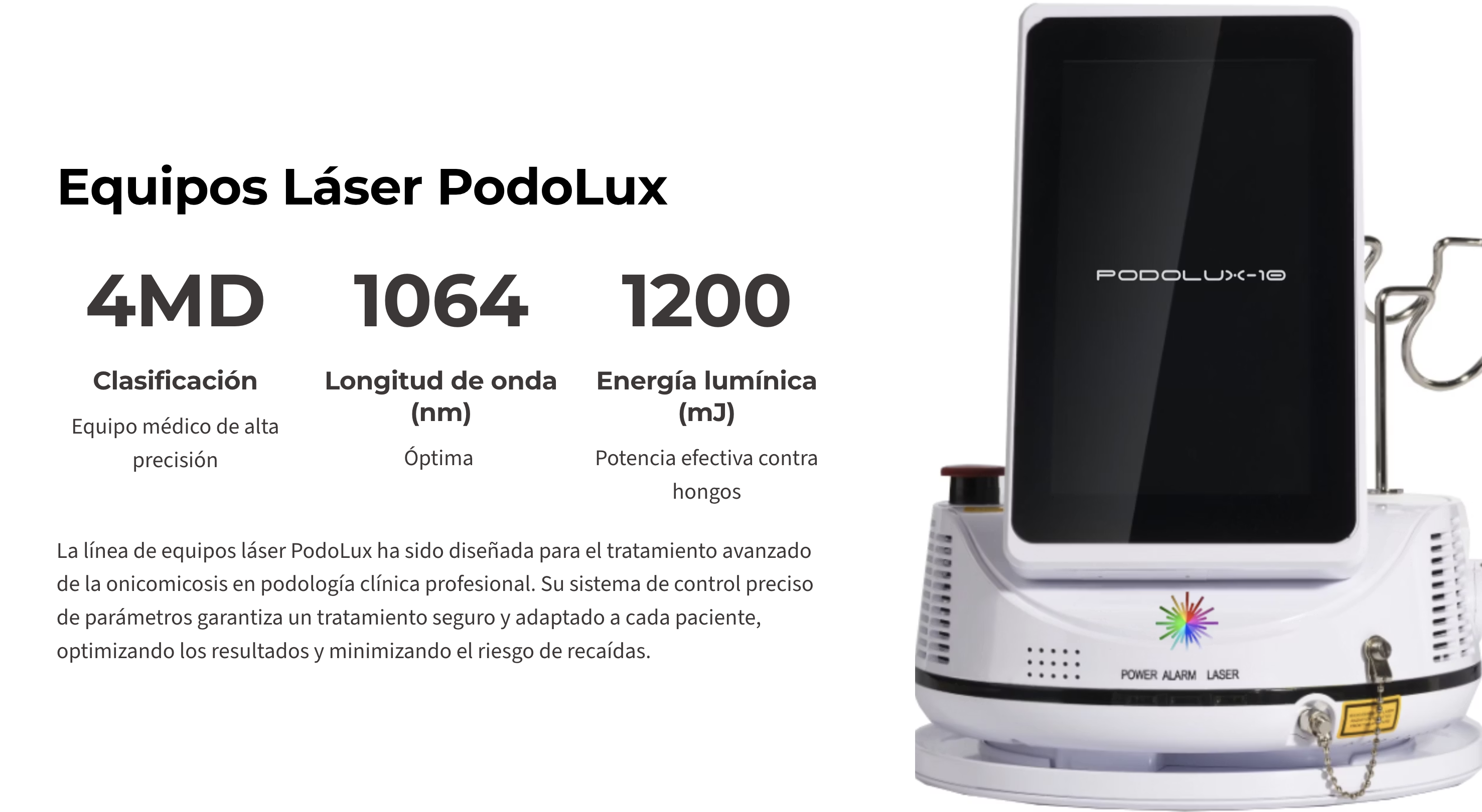 La línea de equipos láser PodoLux ha sido diseñada para el tratamiento avanzado de la onicomicosis en podología clínica profesional. Con clasificación Tipo 4MD, longitud de onda de 1064 nm y energía lumínica de 1200 mJ, el PodoLux actúa con alta efectividad sobre todos los agentes causales, incluidos dermatofitos, levaduras y mohos no dermatofitos. Su sistema de control preciso de parámetros garantiza un tratamiento seguro y adaptado a cada paciente, optimizando los resultados y minimizando el riesgo de recaídas.