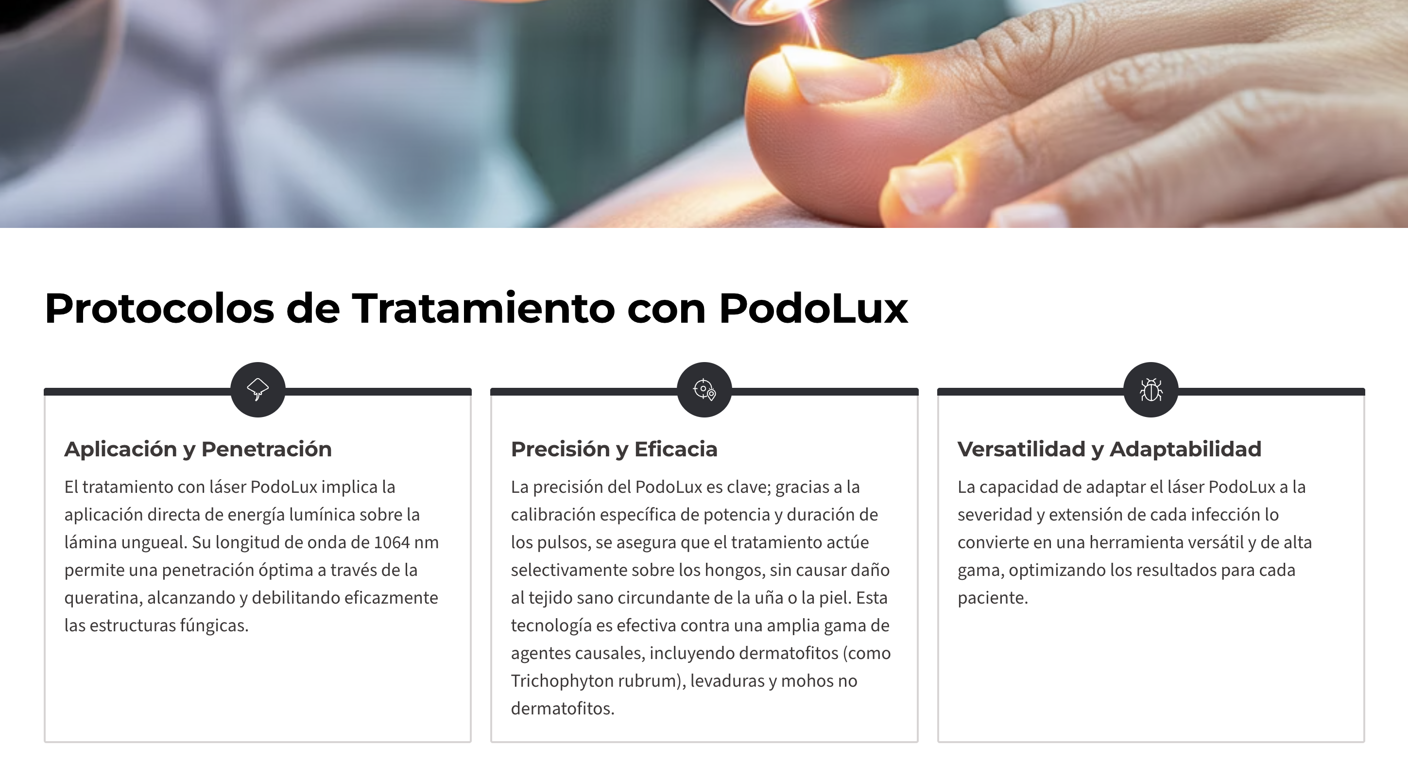 En conclusión, la onicomicosis es una patología frecuente, de difícil manejo con métodos tradicionales y con alta tendencia a la recurrencia. La línea de equipos láser PodoLux ofrece una solución integral, segura y eficaz para todos los agentes causales, incluyendo dermatofitos, levaduras y mohos no dermatofitos. Su tecnología avanzada, combinada con un enfoque clínico especializado, permite lograr resultados superiores, mejorando la salud y estética de las uñas, y elevando el estándar de la podología clínica profesional.