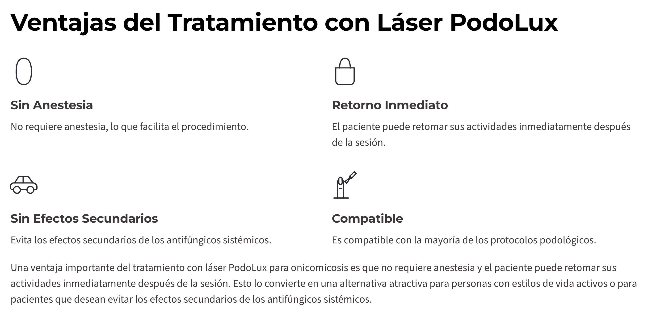 Una ventaja importante del tratamiento con láser PodoLux para onicomicosis es que no requiere anestesia y el paciente puede retomar sus actividades inmediatamente después de la sesión. Esto lo convierte en una alternativa atractiva para personas con estilos de vida activos o para pacientes que desean evitar los efectos secundarios de los antifúngicos sistémicos. Además, el tratamiento es compatible con la mayoría de los protocolos podológicos, por lo que puede integrarse fácilmente en la práctica diaria de una clínica especializada.