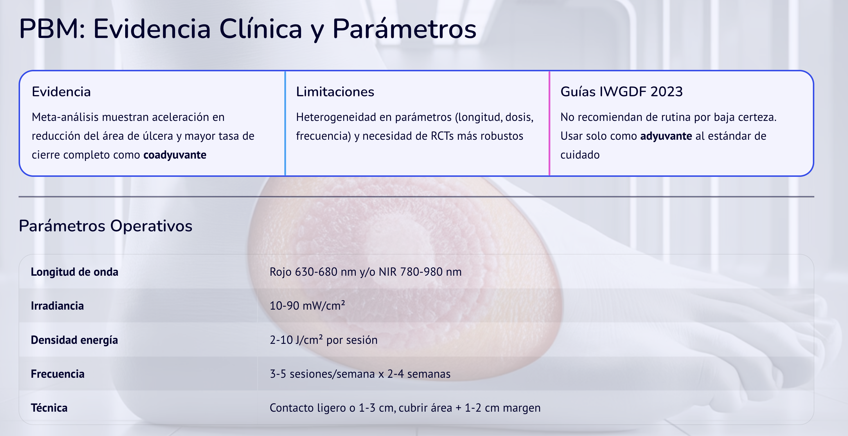 * PBM-NIR (808–980 nm): 6–8 J/cm², 3×/sem x 3–4 sem; priorizar bordes y tejido subyacente.