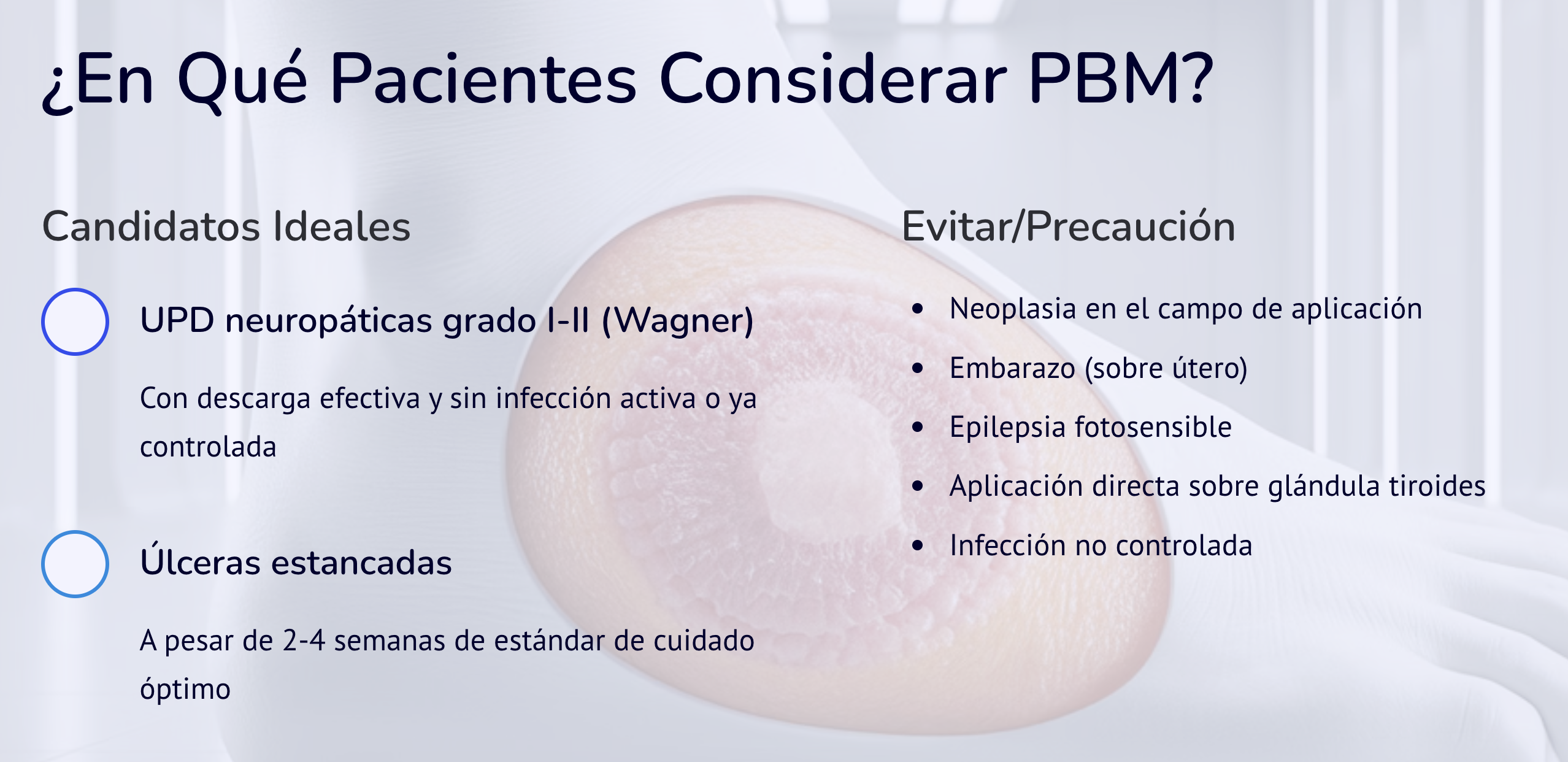 * Meta-análisis y RCTs en úlceras del pie diabético (UPD) muestran que la PBM, como coadyuvante al estándar de cuidado, puede acelerar la reducción del área de la úlcera y aumentar la tasa de cierre completo frente a control. La magnitud del efecto varía entre estudios.