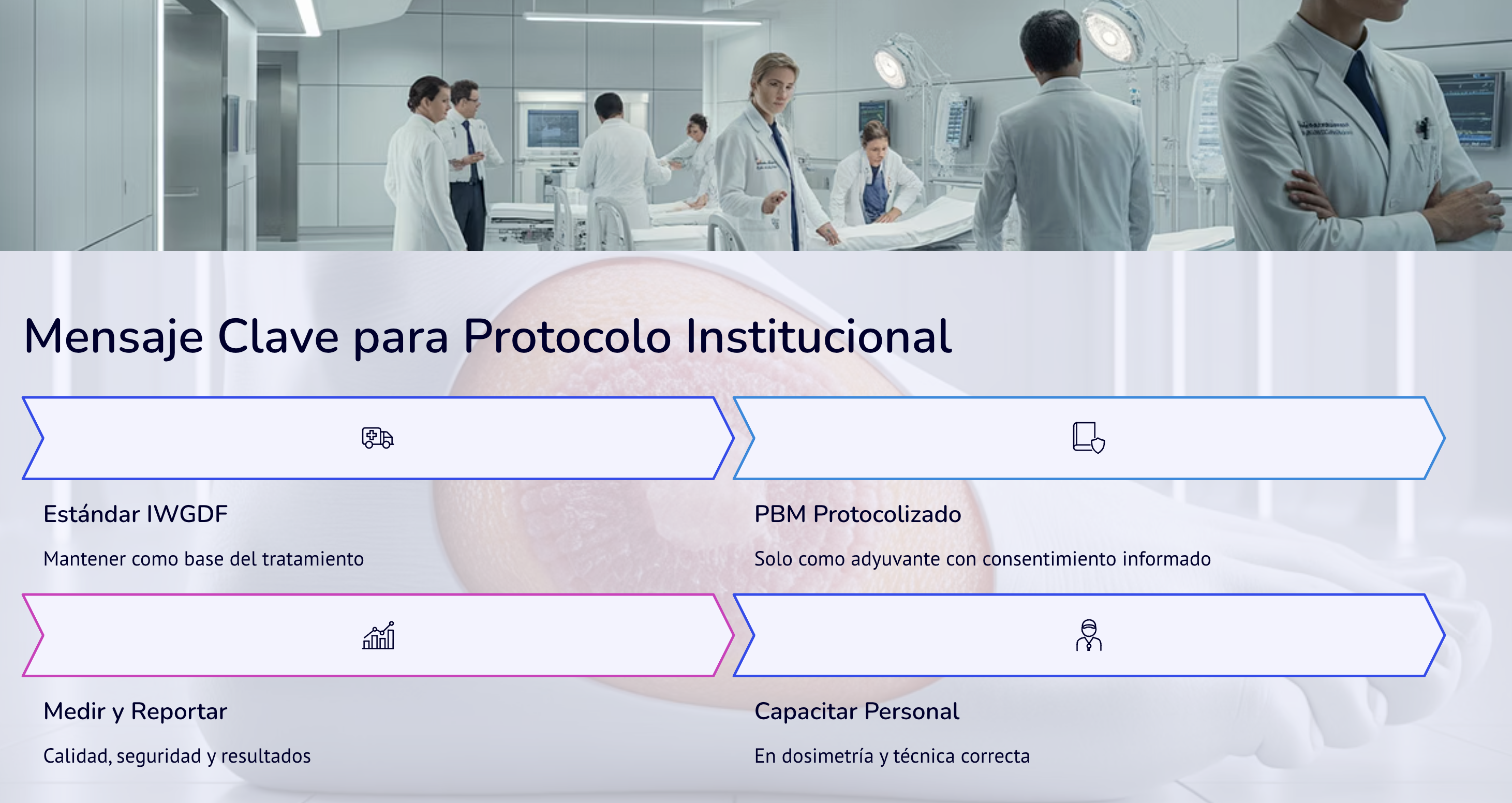 La Fotobiomodulación Láser (PBM) puede considerarse adyuvante en UPD seleccionadas y bien descargadas, con infección controlada y perfusión optimizada, dejando claro que no sustituye al estándar de cuidado.