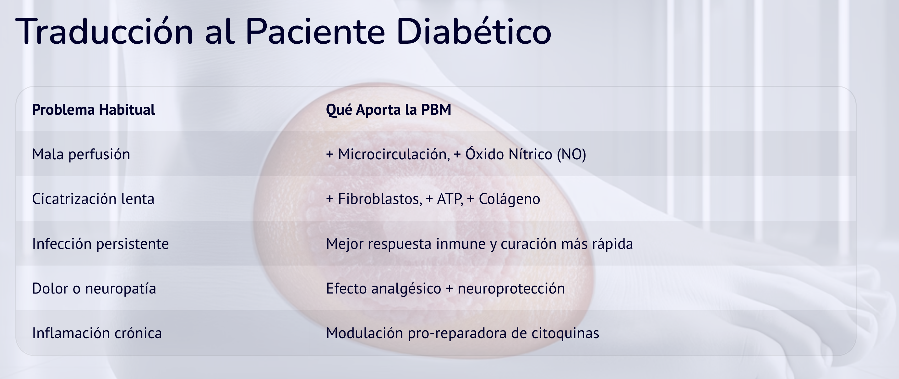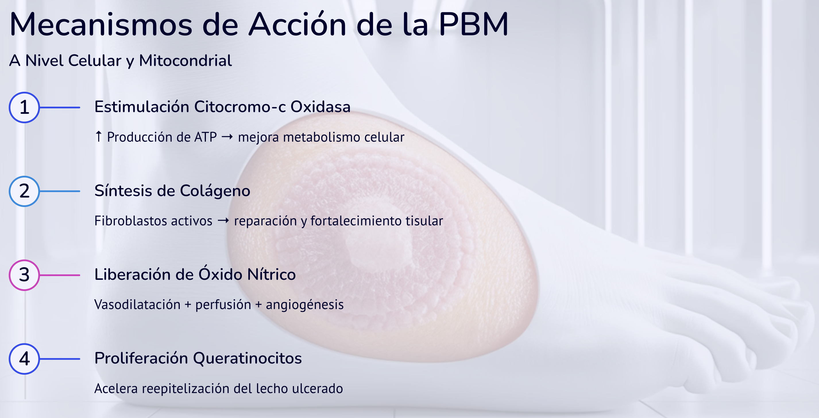 La Fotobiomodulación Láser (PBM) induce efectos fotofísicos → fotoquímicos → biológicos que favorecen la reparación tisular y control inflamatorio en un entorno alterado por la diabetes.